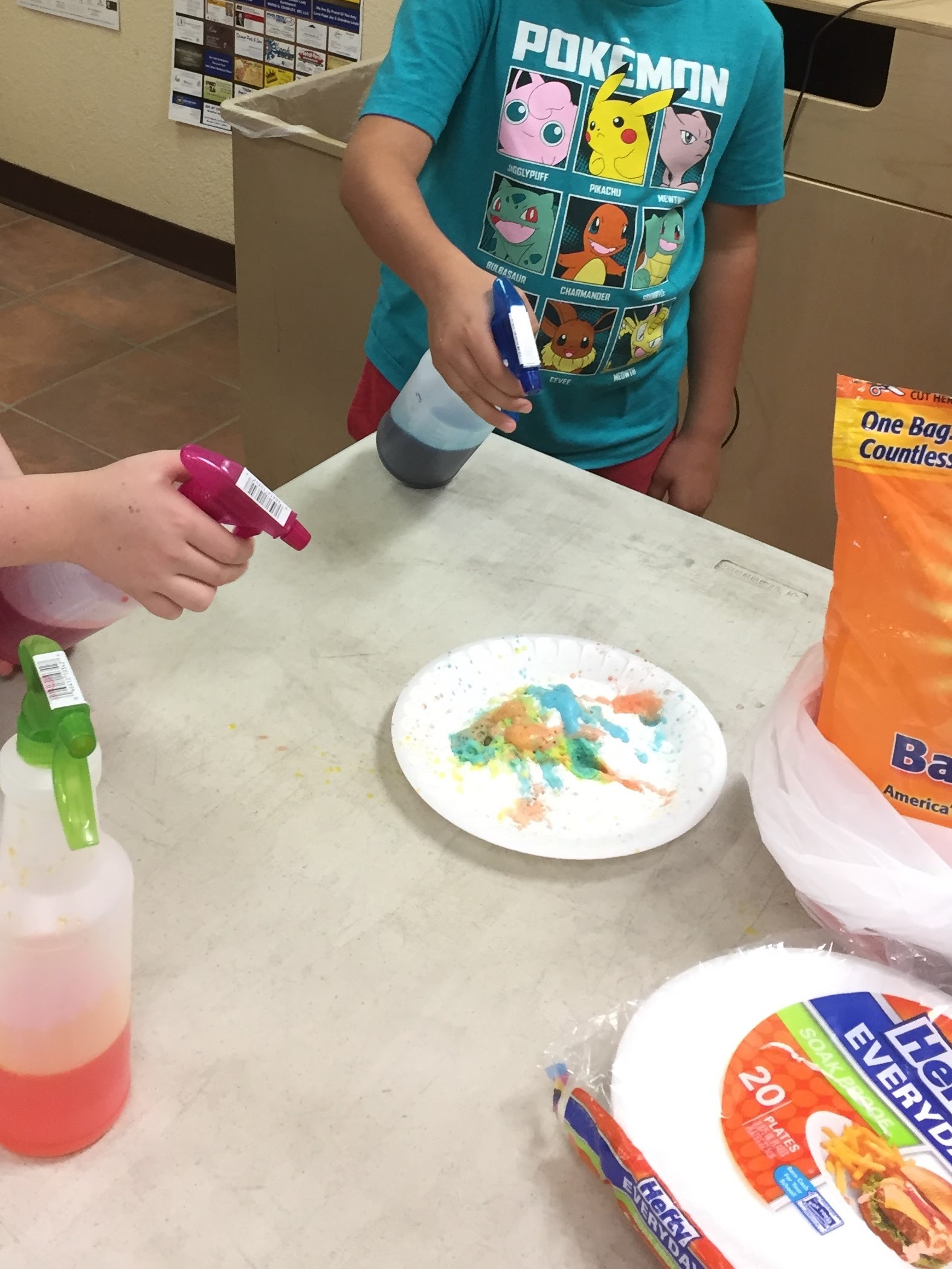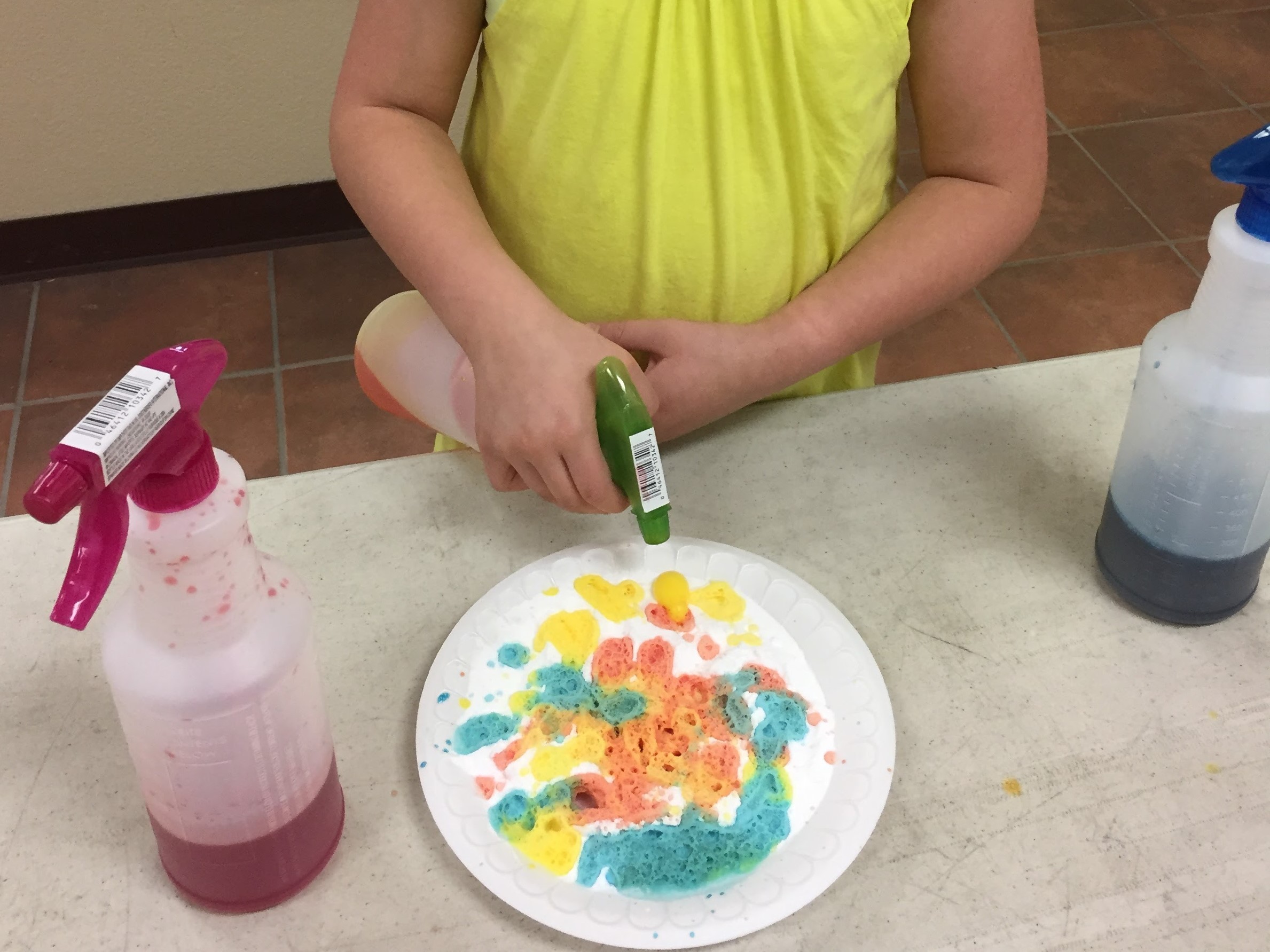 The kiddos loved this station. I purchased some spray bottles at the dollar store, a big bag of baking soda, a bottle of white vinegar, some food coloring, and a package of styrofoam plates. I put the vinegar in the spray bottle along with some food coloring. After putting a large scoop of baking soda on a plate, I let the students spray the colored vinegar on the baking soda. Several wanted to do more than one plate. They had fun watching it bubble up as well as experimenting with color mixing.