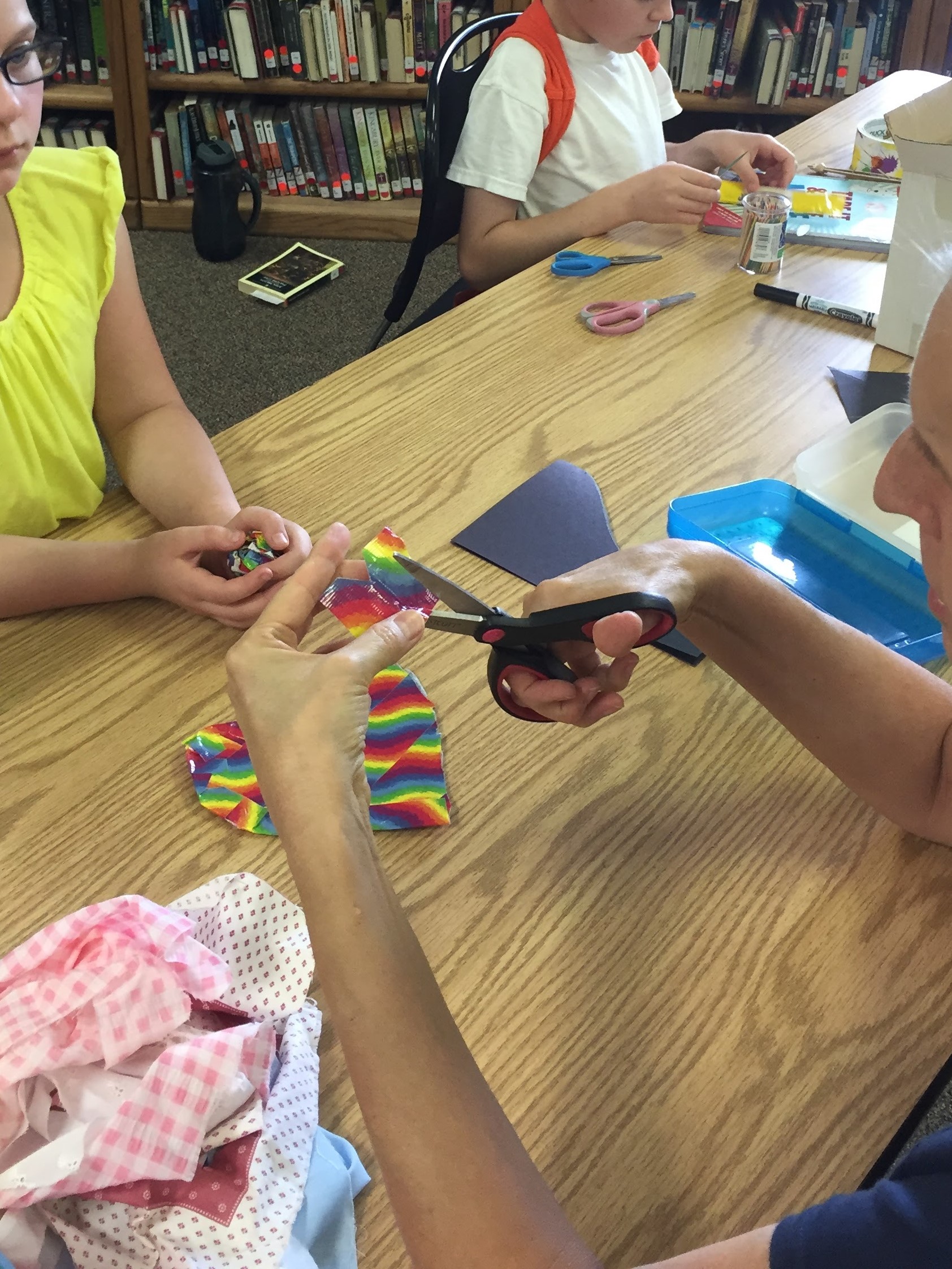 This was a popular station – even my teen male volunteer had to make one. At the end of the school year, I included a request for t-shirts along with my other “junk” supplies. The instruction we followed are found at https://www.mommypotamus.com/no-sew-t-shirt-tote-bag-tutorial/