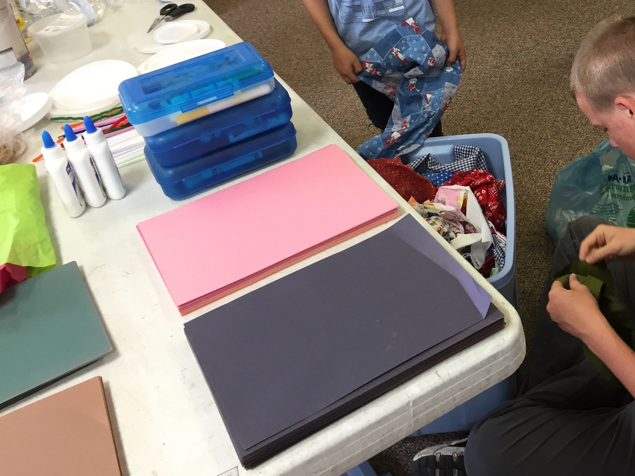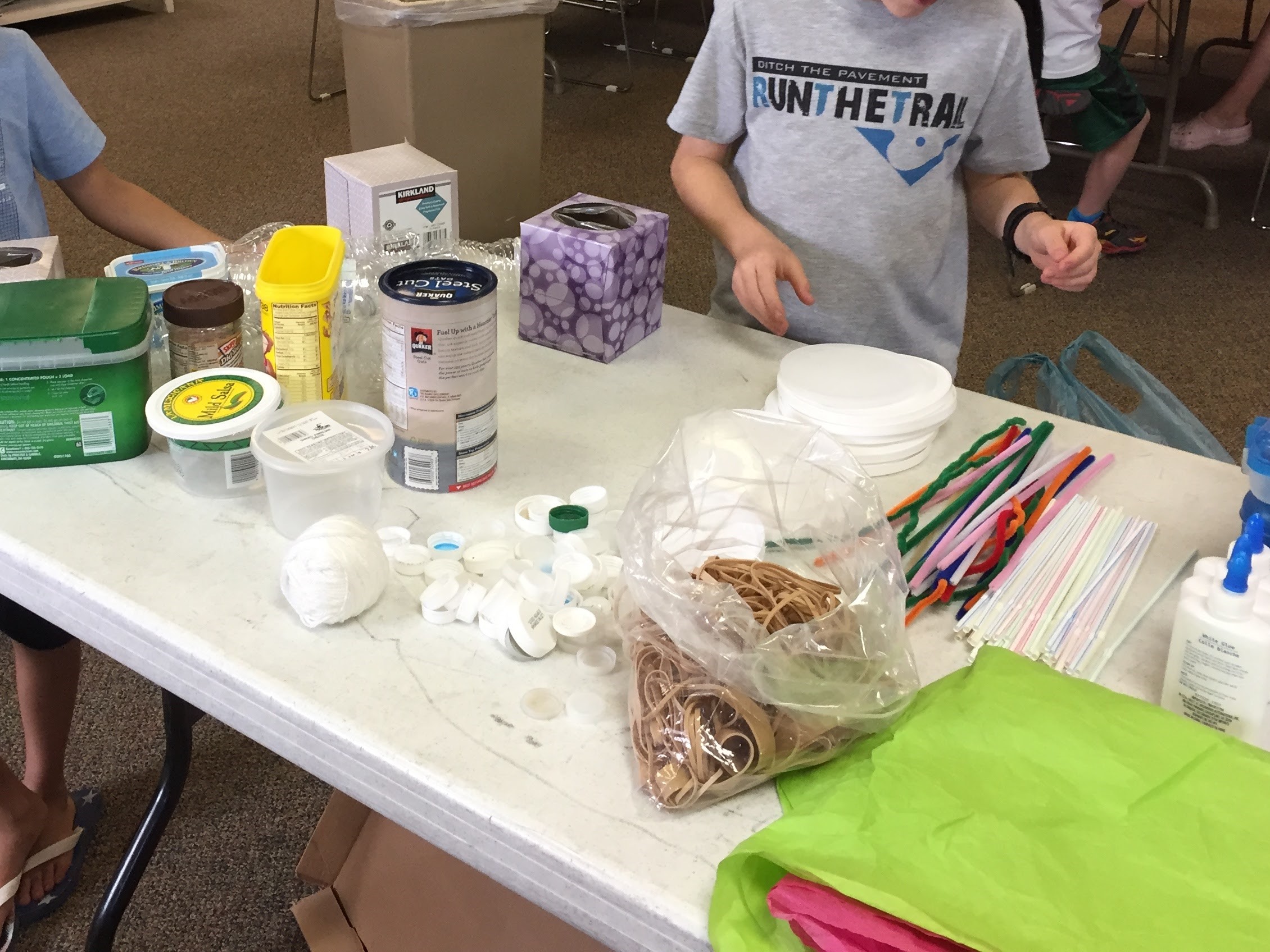 My Supply Table was basically the same for both days. Supplies included basic art supplies like: markers, glue, colored paper, fabric, yarn, etc. It also included things like: a variety of empty boxes, lids from juice containers and sour cream, rubber bands, wax paper, etc. Students could use whatever they needed from this table.